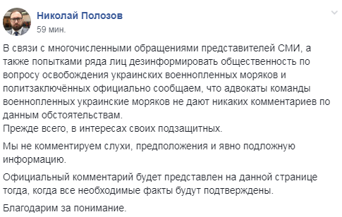 "В связи с многочисленными обращениями представителей СМИ, а также попытками ряда лиц дезинформировать общественность по вопросу освобождения украинских военнопленных моряков и политзаключённых официально сообщаем, что адвокаты команды военнопленных украинских моряков не дают никаких комментариев по данным обстоятельствам. Прежде всего, в интересах своих подзащитных", - говорится в опубликованном сообщении.