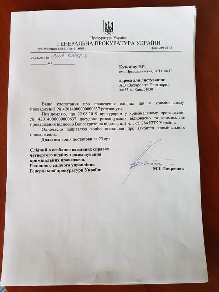Генпрокуратура закрыла уголовное производство против  нардепа 9 созыва и экс-заместителя генпрокурора Рената Кузьмина. Об этом говорится в документе, опубликованном в соцсети бывшим сотрудником ГПУ Владимиром Скородинским, который лишился своей должности за отказ расследовать дело против коллег.