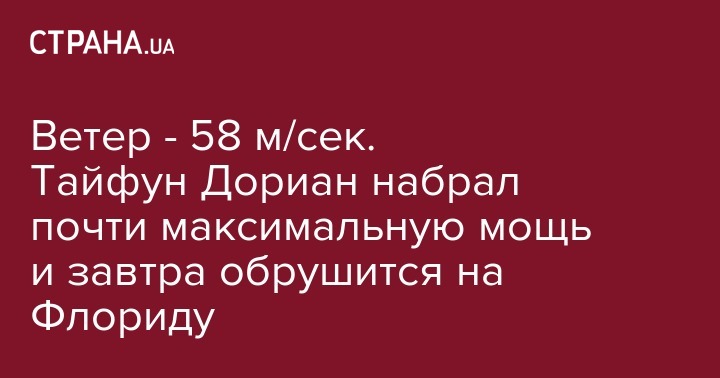 Ветер - 58 м/сек. Тайфун Дориан набрал почти максимальную мощь и завтра обрушится на Флориду