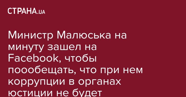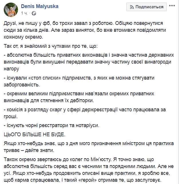 Назначенный 29 августа на пост министр юстиции Украины Денис Малюська извинился перед подписчиками на Facebook, что редко заходит в соцсеть, и оставил запись с просьбой рассказывать ему о коррупции в органах юстиции. Соответствующий пост появился на его странице днем 31 августа.