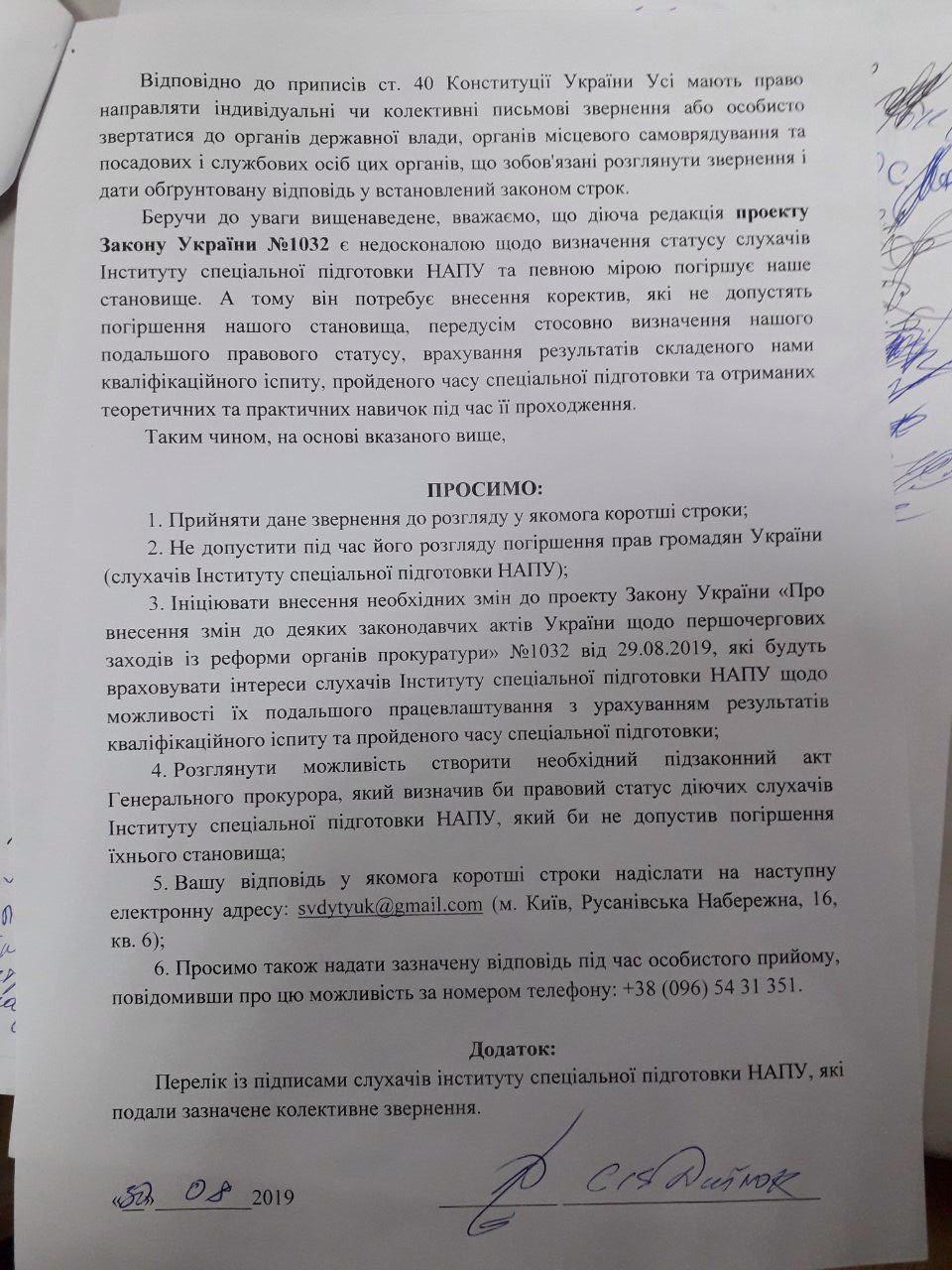 Также протестующие написали официальное письмо-обращение к президенту Украины, в парламент, профильный комитет, квалификационно-дисциплинарную комиссию прокуроров, народному депутату Артему Дмитруку, а также к новоназначенному генеральному прокурору Украины Руслану Рябошапке.