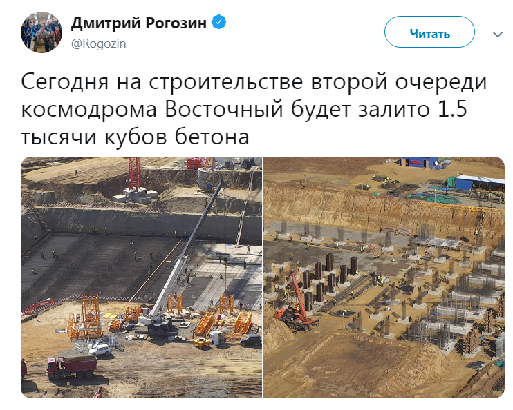 Между тем Рогозин в Twitter отрапортовал, что на строительстве второй очереди космодрома вот-вот будет залито 1,5 тысячи кубов бетона. Один из комментаторов написал, что по радио озвучили совсем иные достижения, заказчики не в восторге и рассматривают возможность привлечения к стройке других ведомств.