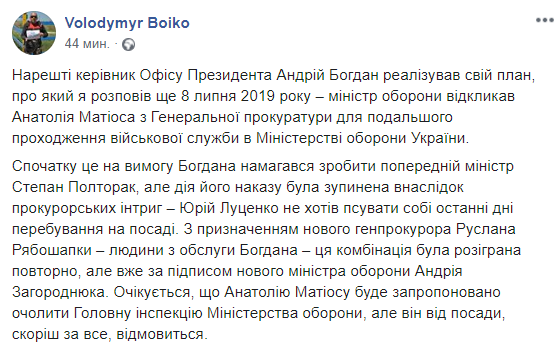 Сначала это по требованию Богдана пытался сделать предыдущий министр Степан Полторак, но действие его приказа было остановлено ​​в результате прокурорских интриг - Юрий Луценко не хотел портить себе последние дни пребывания в должности. С назначением нового генпрокурора Руслана Рябошапки - человека Богдана - эта комбинация была разыграна повторно, но уже за подписью нового министра обороны Андрея Загороднюка. Ожидается, что Анатолию Матиосу будет предложено возглавить Главную инспекцию Министерства обороны, но он от должности, скорее всего, откажется", - написал на своей странице в Facebook Владимир Бойко.