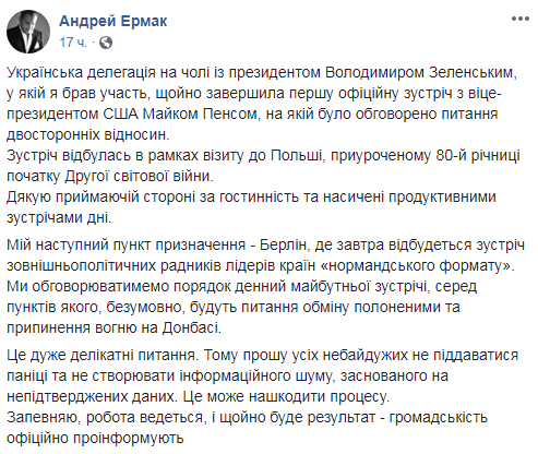 "Мой следующий пункт назначения - Берлин, где завтра (2 сентября - Ред.) состоится встреча внешнеполитических советников лидеров стран "нормандского формата". Мы будем обсуждать повестку дня предстоящей встречи, среди пунктов которого, безусловно, будут вопросы обмена пленными и прекращия огення на Донбассе", - отмечается в опубликованном сообщении. Также известно, что это очень деликатные вопросы.
