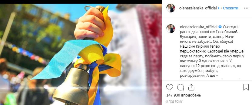 Сообщение первой леди страны Елены Зеленской в Instagram о том, что ее и Владимира Зеленского сын сегодня стал первоклассником, проиллюстрировано фотографией с использованием фотошопа.