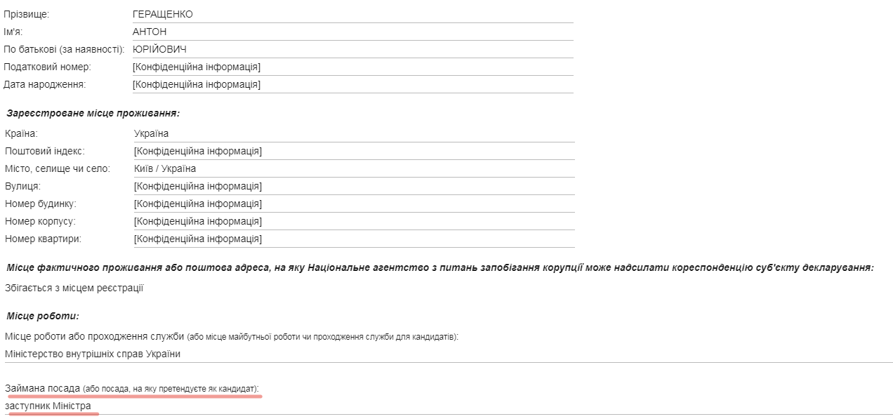 Согласно опубликованным данным, Геращенко подал декларацию в качестве кандидата на должность заместителя главы МВД.