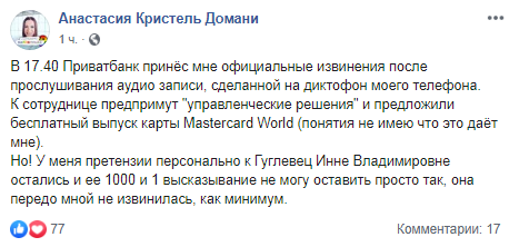 "В 17:40 Приватбанк принёс мне официальные извинения после прослушивания аудио записи, сделанной на диктофон моего телефона. К сотруднице предпримут "управленческие решения" и предложили бесплатный выпуск карты Mastercard World (понятия не имею что это даёт мне)", - сообщила Анасатсия-Крисель.