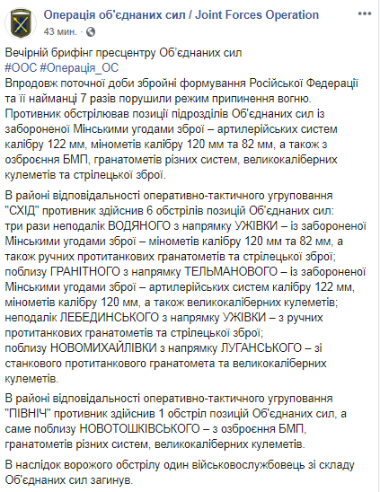 Сообщается, что в течение текущих суток противник 7 раз нарушал режим прекращения огня. Украинские позиции біли обстреляны из запрещенного минскими соглашениями оружия - артиллерийских систем калибра 122 мм, минометов калибра 120 мм и 82 мм, а также из вооружения БМП, гранатометов различных систем, крупнокалиберных пулеметов и стрелкового оружия.