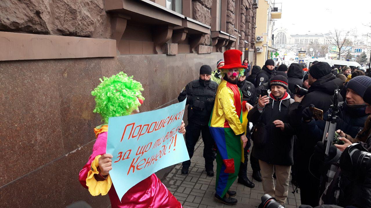 10:42 Пришли двое человек в костюмах клоунов с плакатами "Порошенко - на нары"