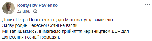 "Допрос Петра Порошенко относительно Минских соглашений завешен. Заявление семей Небесной Сотни не взяли. Мы остаемся, требуем приема руководством ГБР для донесения позиции граждан".