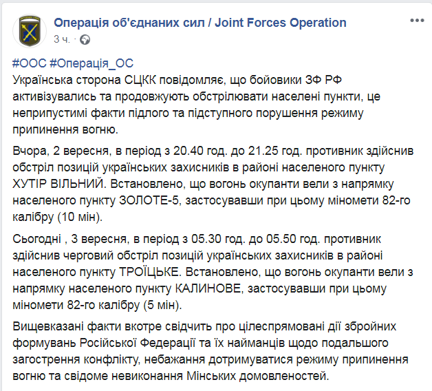 По словам пресс-службы, боевики активизировались еще вчера. Вечером 2 сентября противник обстрелял позиции украинских сил в районе населенного пункта Хутор Вольный. При этом применялись минометы 82-го калибра.