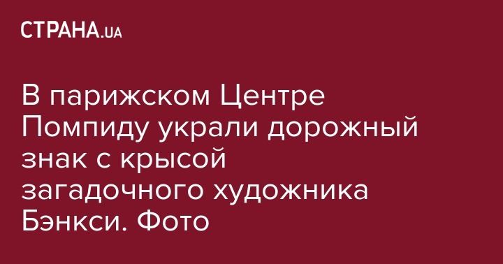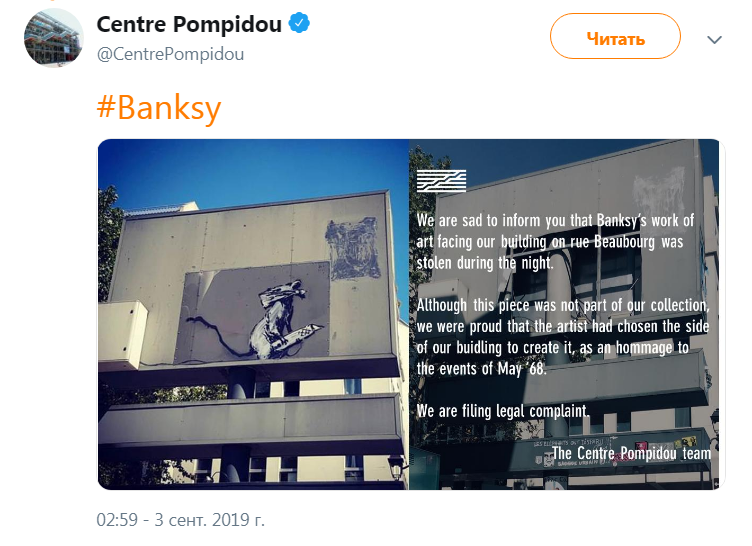 3 сентября в Париже похитили дорожный знак с приписываемым британскому уличному художнику Бэнкси граффити, который стоял у въезда в подземную парковку Центра Помпиду. Об этом сообщается в Twitter музея.