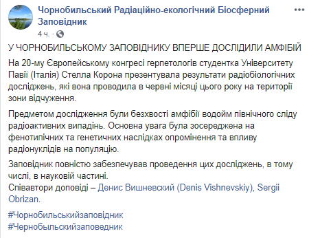 Сообщается, что результаты своих радиобиологических исследований, проведенных в июне этого года на территории зоны отчуждения, на 20-м Европейском конгрессе герпетологов представила студентка Университета Павии (Италия) Стелла Корона.