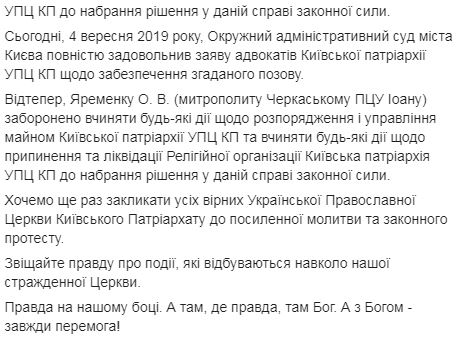 В УПЦ КП напомнили, что ранее по заявлению митрополита Иоанна "были заблокированы счета Киевской патриархии, открытые в Сберегательном банке Украины". После решения суда, пояснили в церкви, ему "запрещено совершать любые действия по распоряжению и управлению имуществом Киевской патриархии УПЦ КП и совершать любые действия по прекращению и ликвидации религиозной организации".