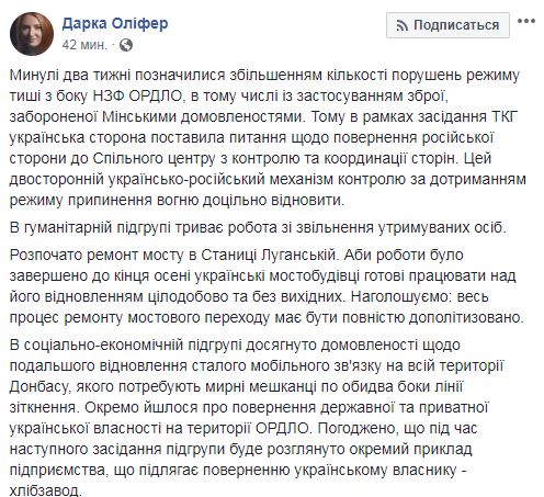 "Прошедшие две недели сказались увеличением количества нарушений режима тишины со стороны незаконных вооруженных формирований отдельных районов Донецкой и Луганской областей, в том числе – с применением оружия, запрещенного Минскими договоренностями. Поэтому в рамках заседания контактной группы украинская сторона поставила вопрос о возвращении российской стороны в СЦКК. Этот двусторонний российско-украинскую механизм контроля за соблюдением режима прекращения огня целесообразно восстановить", – заявила Олифер.