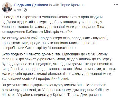 Конкурс на должность уполномоченного по защите государственного языка выиграл бывший народный депутат Тарас Кремень, заявила в Facebook уполномоченный Верховной Рады по правам человека Людмила Денисова.