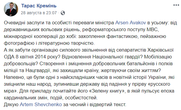 Он также поддерживал Арсена Авакова накануне его переназначения на должность министра внутренних дел.