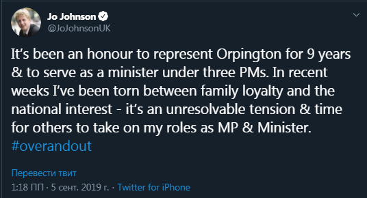 Младший брат премьер-министра Великобритании Джо Джонсон заявил, что уходит с занимаемых им должностей младшего министра по делам университетов и науки, а также депутата британского парламента. Об этом он сообщил в Twitter.