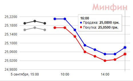 По состоянию на 17:15: покупка 25,09 грн, продажа 25,13 грн. То есть за день курс просел на 6 копеек в сравнении с утренними показателями.