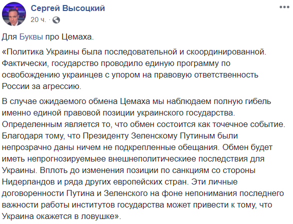 "Я считаю, что обмен Цемаха на украинских политзаключенных оправдан. Если мы, конечно, больше ценим своих людей и граждан, чем государственные интересы", - пишет журналист Виталий Сыч.