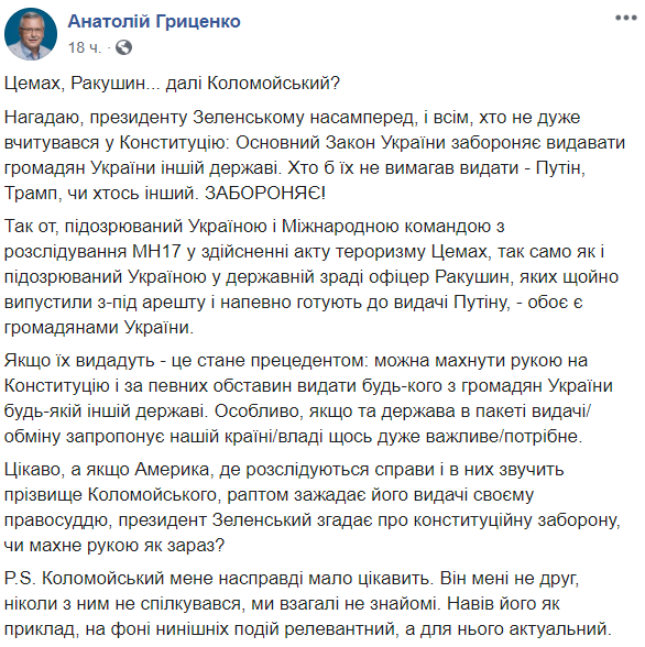 Экс-министр обороны Анатолий Гриценко заявил, что Конституция запрещает выдавать украинских граждан. Забывая, видимо, что по факту тем же "ДНР" и "ЛНР" были выданы уже сотни украинцев.