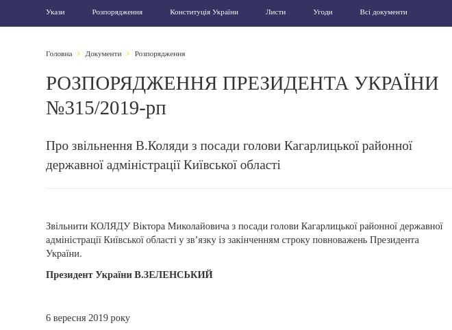 "Уволить Коляду Виктора Николаевича с должности председателя Кагарлыкской районной государственной администрации Киевской области в связи с окончанием срока полномочий Президента Украины", - говорится в документе.