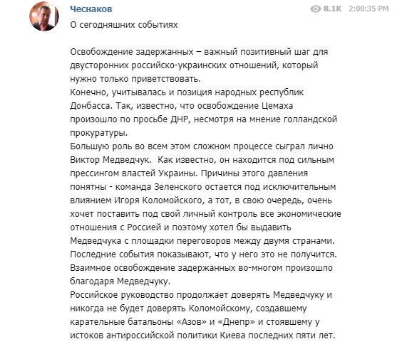"Большую роль во всем этом сложном процессе сыграл лично Виктор Медведчук. Как известно, он находится под сильным прессингом властей Украины. Причины этого давления понятны - команда президента Владимира Зеленского остается под исключительным влиянием Игоря Коломойского, а тот, в свою очередь, очень хочет поставить под свой личный контроль все экономические отношения с Россией и поэтому хотел бы выдавить Медведчука с площадки переговоров между двумя странами. Последние события показывают, что у него это не получится. Взаимное освобождение задержанных во многом произошло благодаря Медведчуку. Российское руководство продолжает доверять Медведчуку и никогда не будет доверять Коломойскому, создавшему батальоны "Азов" и "Днепр" и стоявшему у истоков антироссийской политики Киева последних пяти лет", - заявил Чеснаков.