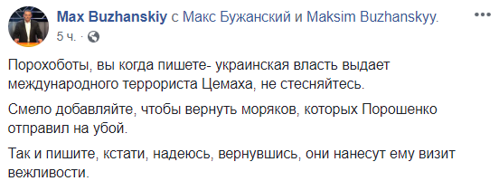"Порохоботы, вы когда пишете – украинская власть выдает международного террориста Цемаха, не стесняйтесь.