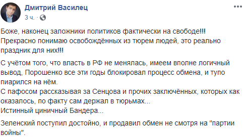Журналист Дмитрий Василец, сам сидевший при Порошенко, считает, что сегодняшний обмен показал, кто на самом деле тормозил освобождение украинцев.
