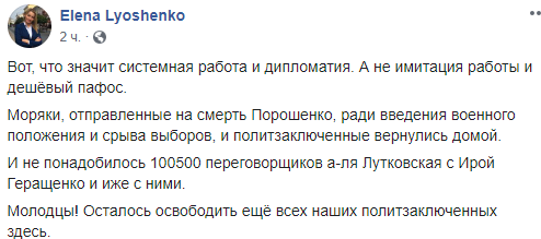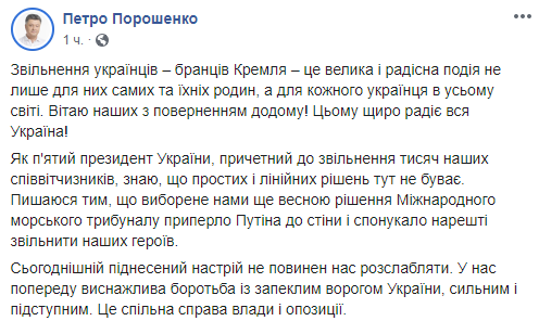 "Как пятый президент Украины, причастный к освобождению тысяч наших соотечественников, знаю, что простых и линейных решений здесь не бывает. Горжусь тем, что завоеванное нами еще весной решение Международного морского трибунала приперло Путина к стене и побудило наконец освободить наших героев", – написал экс-гарант.