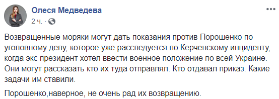 "Возвращенные моряки могут дать показания против Порошенко по уголовному делу, которое уже расследуется по Керченскому инциденту, когда экс-президент хотел ввести военное положение по всей Украине.