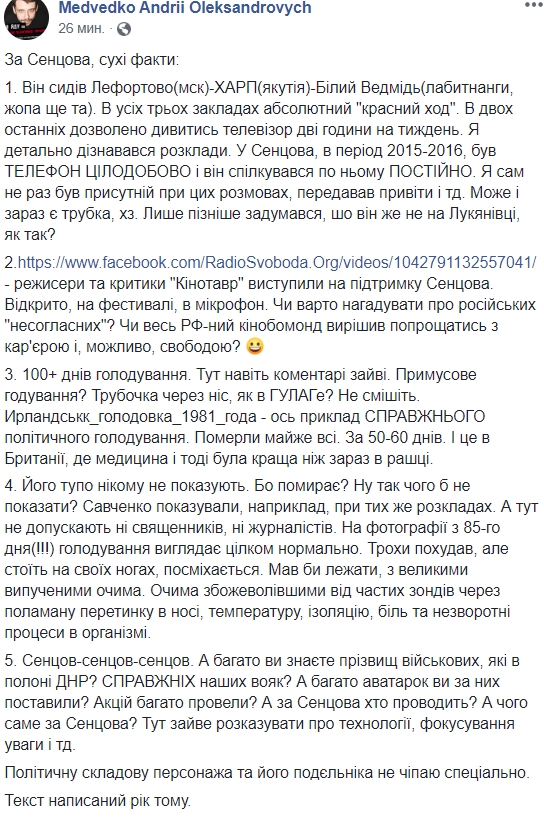 Националист Андрей Медведько, обвиняемый в убийстве писателя Олеся Бузины, перепостил свою запись о Сенцове годичной давности, где критикует режиссера и считает "ненастоящим" политзаключенным.