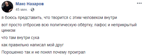 "Я боюсь представить, что творится с этим человеком внутри. Вот просто отбросив всю политическую обертку, пафос и неприкрытый цинизм ... Порошенко так и не понял, почему проиграл".