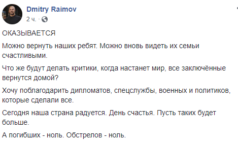 "1. Обмен это хорошо. Замечательно что на свободе Цемах которого украинские спецслужбисты похитили из собственной квартиры, Вышинский который сидел вообще не понятно за, что и другие люди которые были пленниками киевского режима.