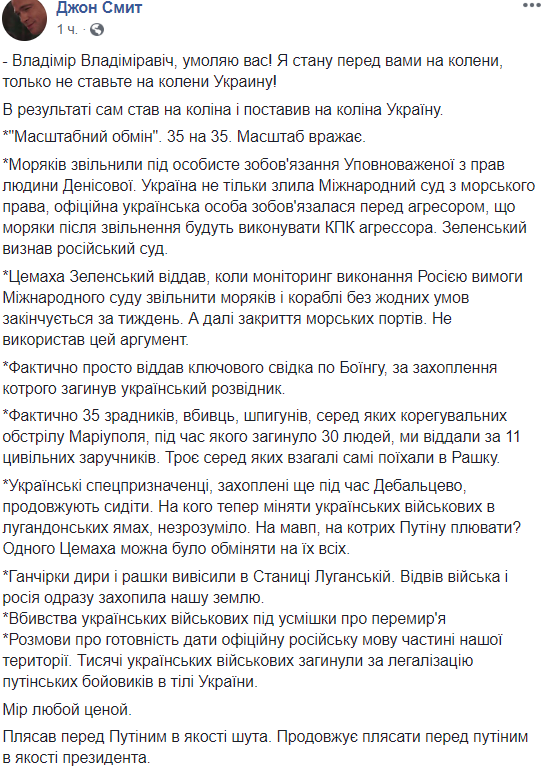 Блогер-порохобот Джон Смит заявил после обмена, что Зеленский "пляшет перед Путиным в качестве клоуна" и что украинский президент "признал российский суд".