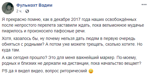 "Я прекрасно помню, как в декабре 2017 года наших освобожденных после непростого перелета заставили ждать, пока вельможное мудачье пиарилось и произносило пафосные речи.