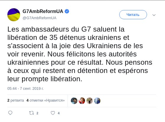 Послы стран Большой семерки (G7) поздравляют Украину с обменом и приветствуют освобождение 35 украинских граждан. Об этом говорится Twitter-аккаунте председательства Франции в Группе поддержки послов G7 в Киеве.