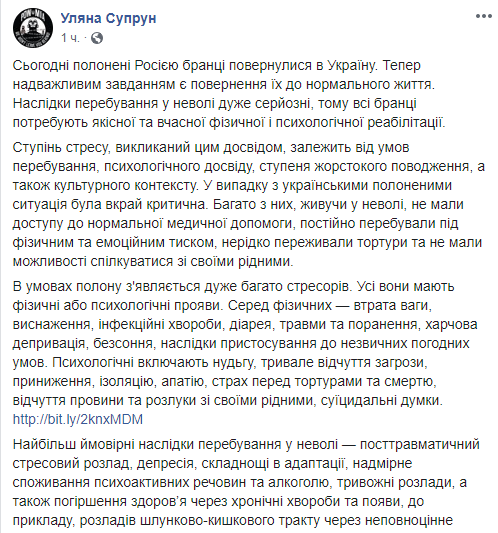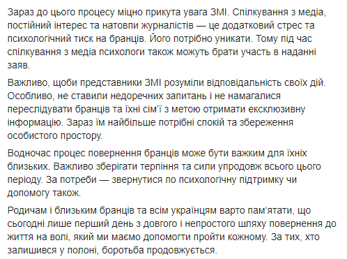 "Родственникам и близким пленников и всем украинцам стоит помнить, что сегодня только первый день из долгого и непростого пути возвращения к жизни на свободе, который мы должны помочь пройти каждому. За тех, кто остался в плену, борьба продолжается", - заключила Супрун.