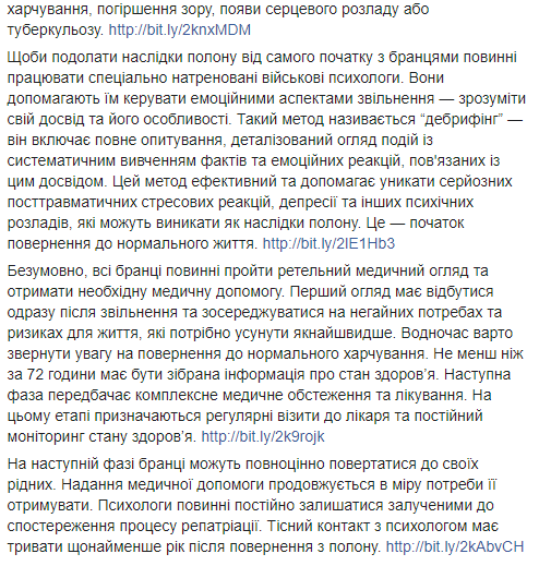 "Чтобы преодолеть последствия плена с самого начала с пленниками должны работать специально обученные военные психологи. Они помогают им управлять эмоциональными аспектами освобождения - понять свой опыт и его особенности. Такой метод называется "дебрифинг" - он включает полный опрос, детализированный обзор событий с систематическим изучением фактов и эмоциональных реакций, связанных с этим опытом. Этот метод эффективен и помогает избегать серьезных посттравматических стрессовых реакций, депрессии и других психических расстройств, которые могут возникать как последствия плена. Это - начало возвращения к нормальной жизни", - пояснила Супрун.