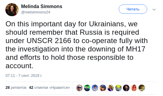 "В этот важный для украинцев день мы должны помнить, что в соответствии с резолюцией 2166 СБ ООН Россия обязана в полной мере сотрудничать с расследованием по сбитому MH17 и усилиями по привлечению к ответственности виновных", - написала Симмонс.