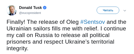 "Освобождение Олега Сенцова и украинских моряков приносит мне облегчение. Я продолжаю призывать Россию освободить всех политических заключенных и уважать территориальную целостность Украины", - написал Туск.