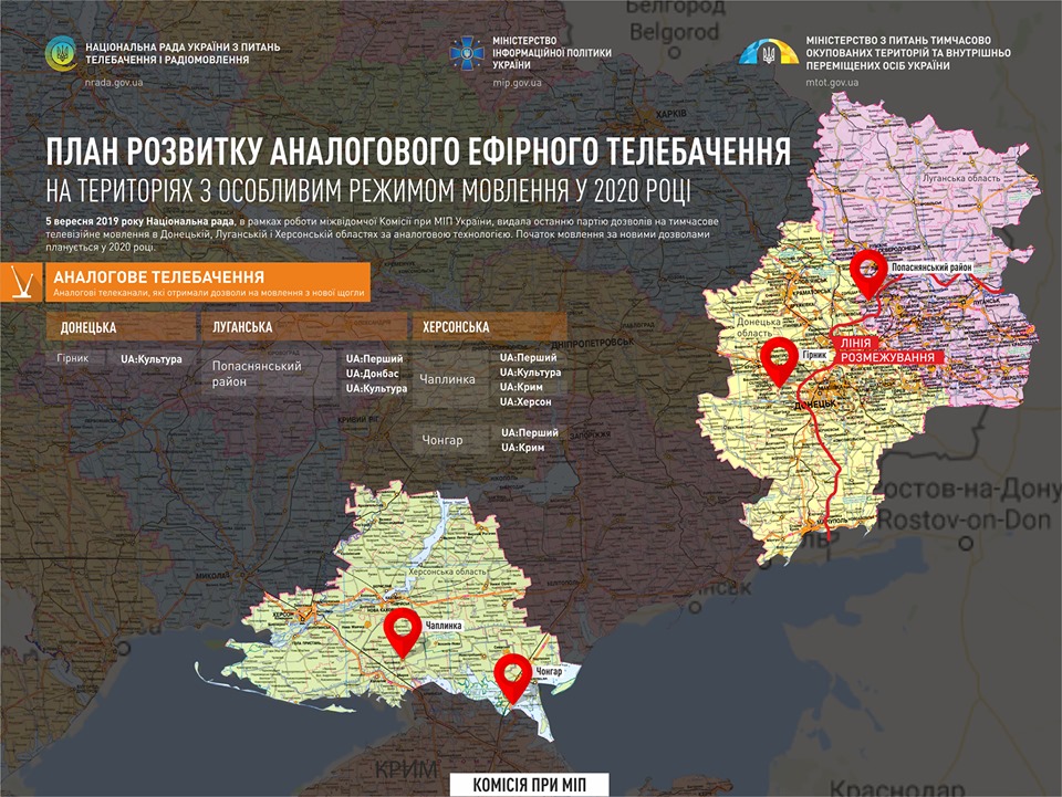 "Национальный совет вместе с Министерством информационной политики Украины подготовил План действий-2020 по развитию аналогового телевидения в Донецкой, Луганской и Херсонской областях. План действий-2020 предусматривает установку дополнительных передатчиков аналогового телевидения в Чаплинке и Чонгаре Херсонской области, в Попаснянском районе Луганской и в Горняке Донецкой областей", - говорится в сообщении.