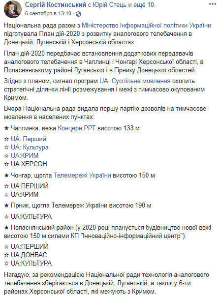 Костинский добавил, что согласно плану, сигнал программ UA: Общественное вещание охватит стратегические участки линии разграничения и границы с аннексированным Крымом.
