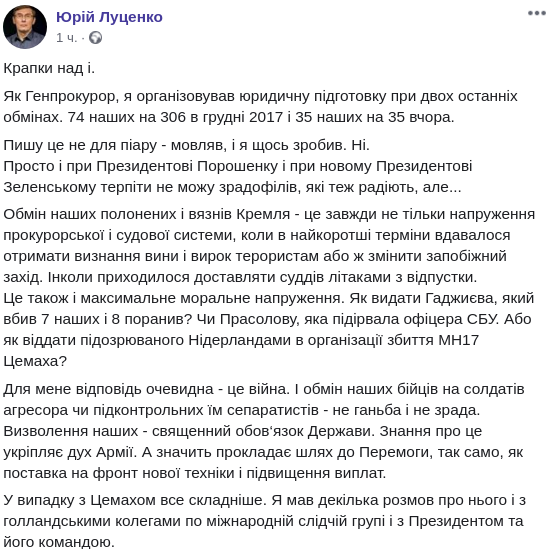 "Для всех, кто шепчет или кричит о "зраде", хочу сказать: украинская сторона отложила обмен и сделала (уже после моей отставки) все возможное в сложившейся ситуации. Допрос Цемаха состоялся. От сделки со следствием он отказался. Выдать его Нидерландам мы не имеем права из-за положения Конституции", - написал он.