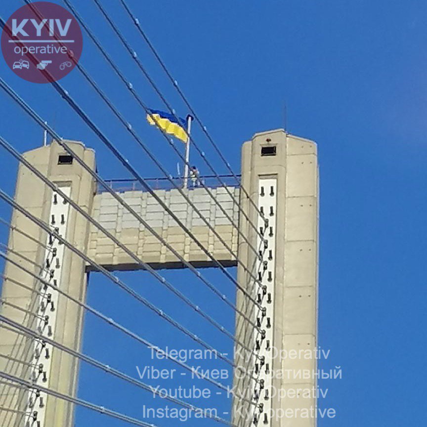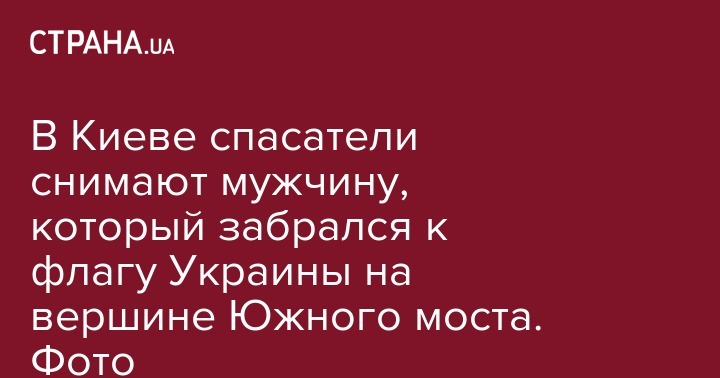 В Киеве мужчина залез на вершину Южного моста, где установлен флаг Украины. Доставать неизвестного оттуда приехали спасатели из Киевской службы спасения.