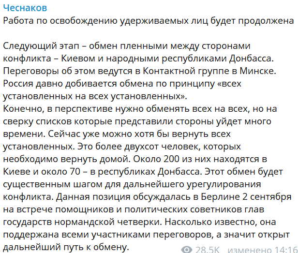 То есть формула, о которой говорит Чеснаков - это 200 заключенных из Украины на 70 тех, кого удерживают сепаратисты.