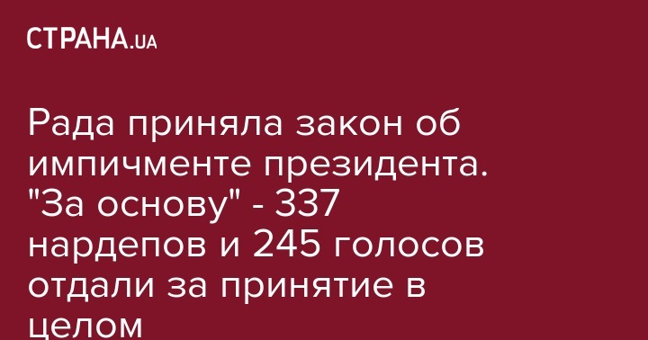 "Основанием для инициирования импичмента является письменное представление, подписанное большинством народных депутатов Украины от конституционного состава Верховной Рады, подписи которых не отзываются. ... Верховная Рада большинством голосов народных депутатов Украины от ее конституционного состава принимает решение об инициировании импичмента и включении его в повестку дня сессии Верховной Рады как безотлагательного", - говорится в законопроекте.