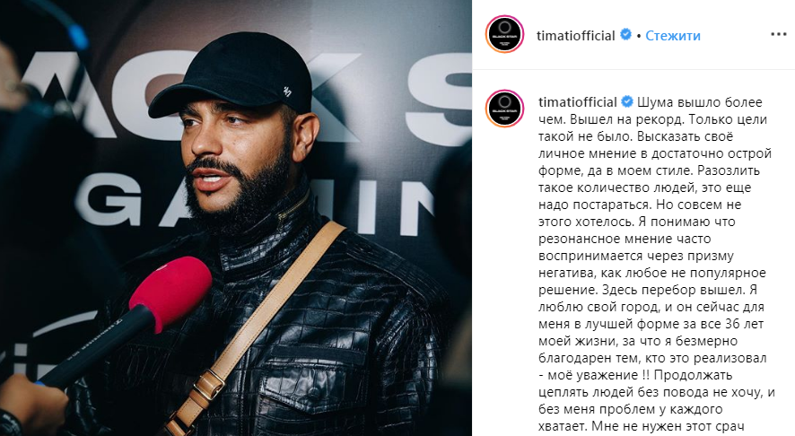 "Шума вышло более чем. Вышел на рекорд. Только цели такой не было. Высказать свое личное мнение в достаточно острой форме - да, в моем стиле. Разозлить такое количество людей - это еще надо постараться. Но совсем не этого хотелось. Я понимаю что резонансное мнение часто воспринимается через призму негатива, как любое не популярное решение. Здесь перебор вышел. Я люблю свой город, и он сейчас для меня в лучшей форме за все 36 лет моей жизни, за что я безмерно благодарен тем, кто это реализовал - мое уважение. Продолжать цеплять людей без повода не хочу, и без меня проблем у каждого хватает. Мне не нужен этот срач точно, поэтому, дорогие друзья: удаляю это видео что бы не продолжать эту волну негатива. Цели обидеть кого-либо не было", - говорится в опубликованном сообщении Тимати.