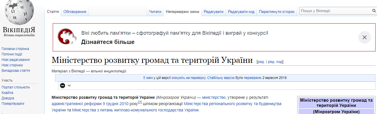 В интернет-энциклопедии "Википедия" дали созданному в результате слияния двух ведомств Министерству развития громад и территорий Украины аббревиатуру "Минразгром".