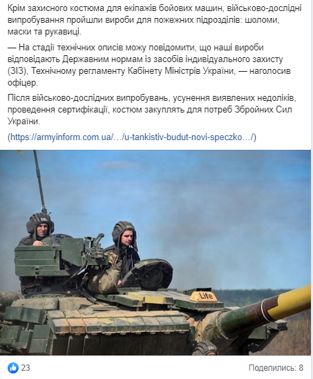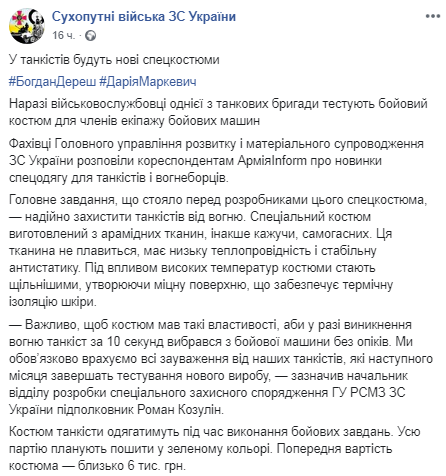 Костюм танкисты будут надевать во время выполнения боевых задач. Всю партию планируют сшить в зеленом цвете. Предварительная стоимость одного костюма - около 6 тысяч гривен. Кроме защитного костюма для экипажей боевых машин, военно-исследовательские испытания прошли изделия для пожарных подразделений: шлемы, маски и перчатки.